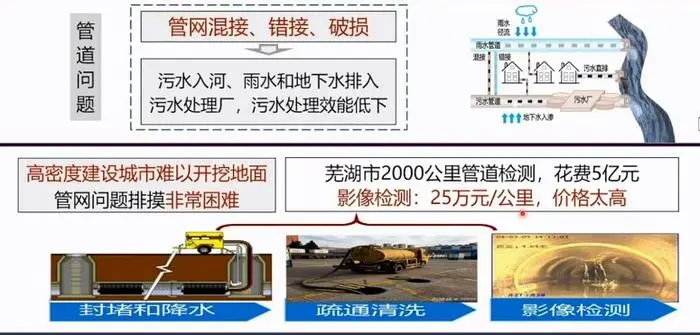 徐祖信表示,一是混接,污水管道接入雨水系統,導致污水直接排河;二是污水管道破損現象嚴重,導致地下水排入污水處理廠;三是錯接,雨水管道接入污水系統,導致雨水進入污水處理廠;四是混流,合流管道和分流管道串接,導致污水管網不成體系。
