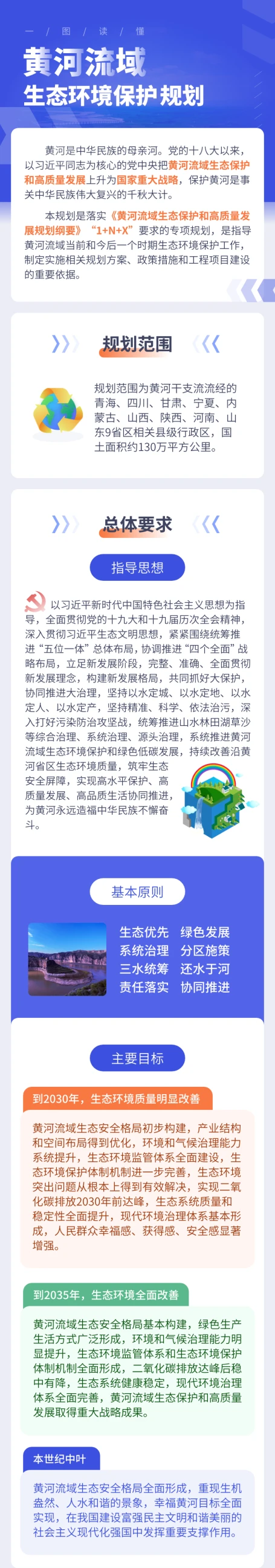 《規(guī)劃》聚焦解決黃河流域突出的生態(tài)環(huán)境問題,分別提出2030年、2035年和本世紀中葉的生態(tài)環(huán)境保護目標。到2030年,生態(tài)環(huán)境質(zhì)量明顯改善。黃河流域生態(tài)安全格局初步構建,產(chǎn)業(yè)結構和空間布局得到優(yōu)化,環(huán)境和氣候治理能力系統(tǒng)提升,生態(tài)環(huán)境監(jiān)管體系全面建設,生態(tài)環(huán)境保護體制機制進一步完善,生態(tài)環(huán)境突出問題從根本上得到有效解決,實現(xiàn)二氧化碳排放2030年前達峰,生態(tài)系統(tǒng)質(zhì)量和穩(wěn)定性全面提升,現(xiàn)代環(huán)境治理體系基本形成,人民群眾幸福感、獲得感、安全感顯著增強。