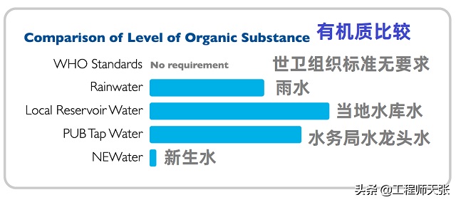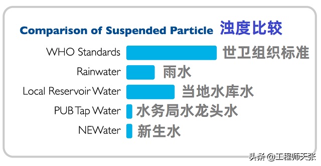 此外,江河和水利樞紐水里帶有較多的是懸浮顆粒和膠體溶液顆粒物,這種顆粒物被地面上的降水沖洗到河水和水利樞紐中。而新生水因為活性炭過濾,使產生水渾濁度的殘渣顆粒物成分大幅度降低,因此NEWater 比 PUB 水更為清亮。