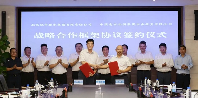 9月19日,北京排水集團與中國南水北調集團水務投資公司簽署戰略合作協議。中國南水北調集團水務投資公司黨委書記、董事長樊新中,黨委副書記、副總經理杜國志,副總經理劉凱、鄭少博、畢波,北京排水集團黨委書記、董事長張建新,黨委副書記、總經理張榮兵,副總經理鄺諾參加簽約儀式。