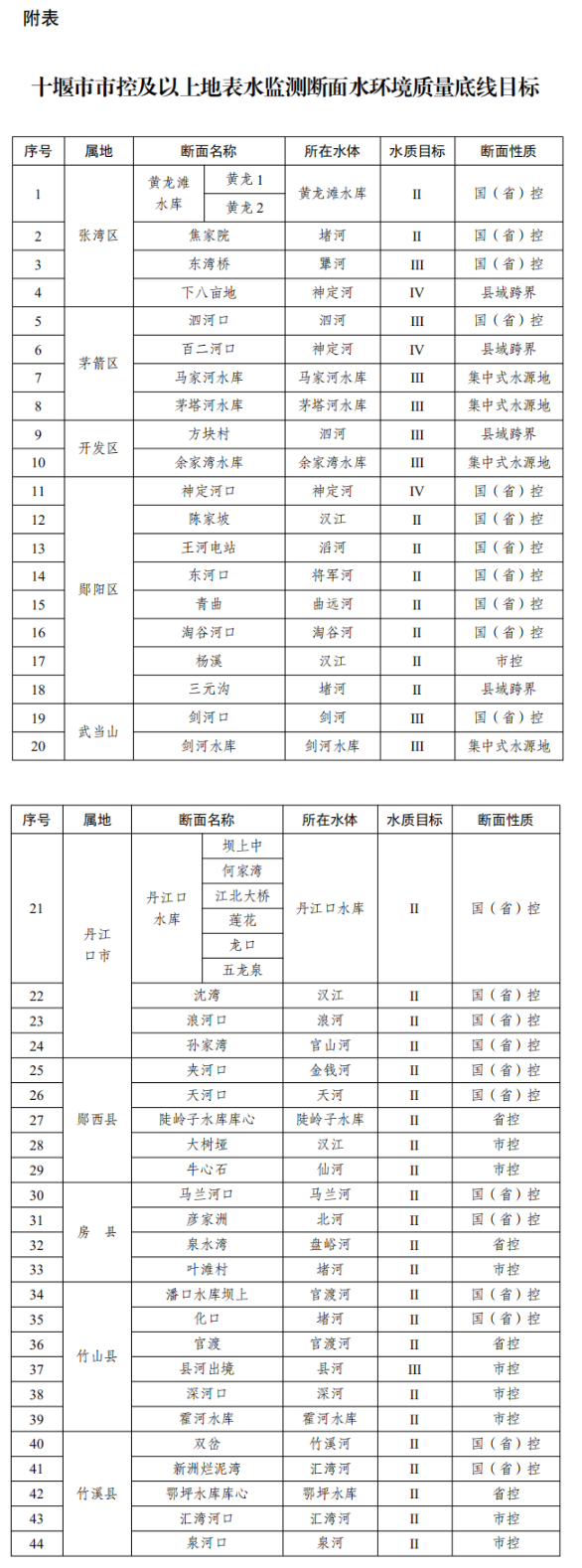 附表:十堰市市控及以上地表水監(jiān)測斷面水環(huán)境質(zhì)量底線目標(biāo)