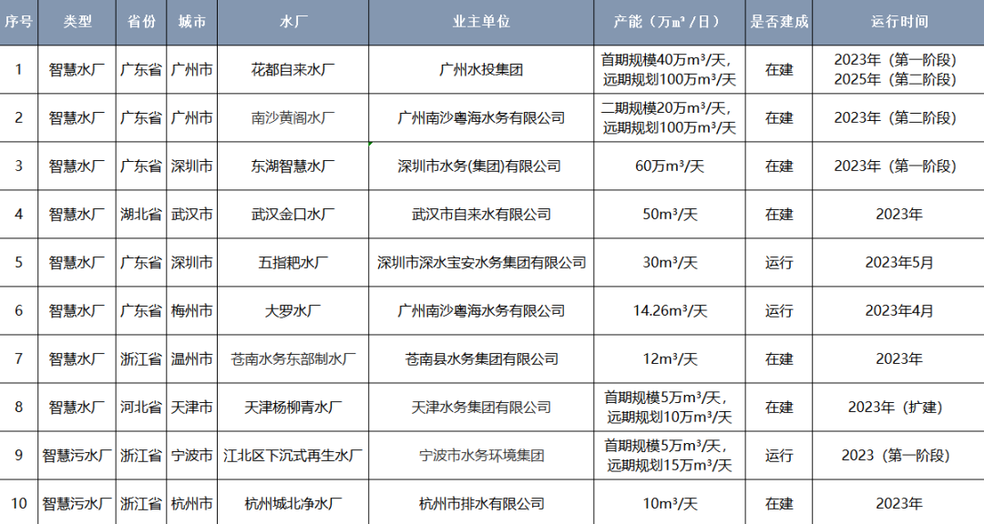 水務(wù)加對(duì)2023年上半年國(guó)內(nèi)新建或升級(jí)改造的智慧水廠、智慧污水廠進(jìn)行了盤點(diǎn),其中智慧水廠共8家,智慧污水廠共2家,詳情如下 (按產(chǎn)能進(jìn)行排序):