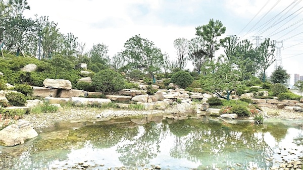 據介紹,該處抽取附近中心溝內的中水,從高處流下,形成疊石瀑布的景觀。一座座水池,加上周邊層次變化豐富的植被、花卉,形成一個個小微濕地,成為梧桐雨的天然蓄水池,向7大區域的周邊植被供水。數據顯示,中水回用可覆蓋片區內214公頃綠化灌溉和水體補給,年節水64.5萬立方米,年節約成本187萬元。