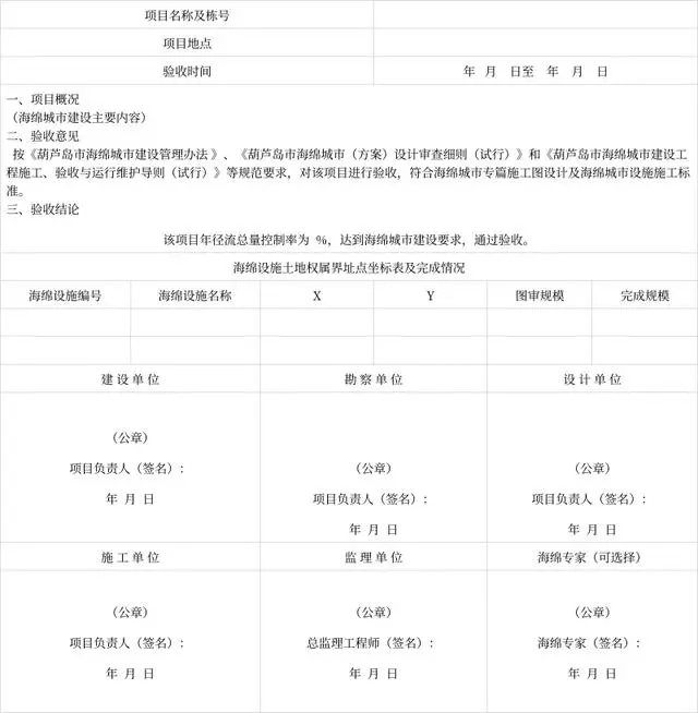 建設單位組織對海綿城市設施進行專項驗收,形成海綿城市建設項目驗收報告,必要時可組織專家驗收。項目建設單位組織對驗收資料進行歸檔。海綿城市建設主管部門對海綿城市驗收項目進行現場核驗。