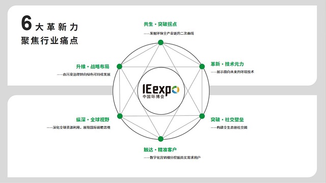 為適應(yīng)當(dāng)前的發(fā)展形勢,中國環(huán)博會IE expo將持續(xù)推進(jìn)六大能力的自我革新,即:一、拓展數(shù)智化等跨界產(chǎn)業(yè)與傳統(tǒng)環(huán)保產(chǎn)業(yè)的共融交集,提升平臺“共生力”,發(fā)掘環(huán)保全產(chǎn)業(yè)鏈內(nèi)的發(fā)展第二曲線;二、由污染治理轉(zhuǎn)向綠色可持續(xù)發(fā)展,培育在碳中和領(lǐng)域的戰(zhàn)略布局,提升平臺“升維力”;三、展出面向未來的環(huán)境技術(shù),提升平臺“革新力”,提升環(huán)保科技創(chuàng)新動能;四、深化IFAT全球資源的利用,展現(xiàn)國際前瞻思維,提升平臺“視野力”;五、創(chuàng)造平臺打破創(chuàng)新鏈、產(chǎn)業(yè)鏈、資金鏈、人才鏈的融合壁壘,提升平臺“社交力”;六、深化數(shù)字營銷體系,配合發(fā)起關(guān)鍵營銷戰(zhàn)役,精準(zhǔn)聚攏真實需求用戶人群,提升平臺“觸達(dá)力”。