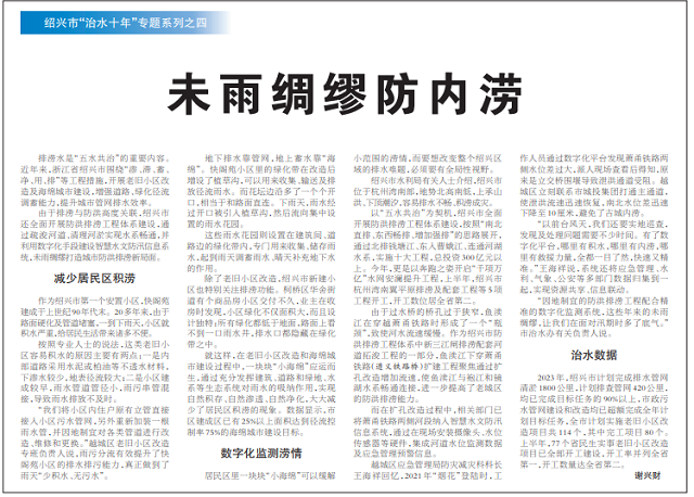 排澇水是“五水共治”的重要內(nèi)容。近年來,浙江省紹興市圍繞“滲、滯、蓄、凈、用、排”等工程措施,開展老舊小區(qū)改造及海綿城市建設(shè),增強(qiáng)道路、綠化徑流調(diào)蓄能力,提升城市管網(wǎng)排水效率。