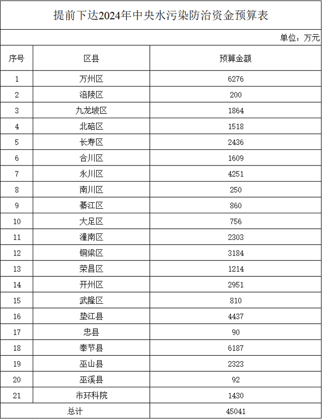 根據(jù)《重慶市財政局關于提前下達2024年中央水污染防治資金預算的通知》,為促進水環(huán)境質(zhì)量改善,加快推進水污染防治工作,筑牢長江上游重要生態(tài)屏障,根據(jù)財政部《關于提前下達2024年水污染防治資金預算的通知》(財資環(huán)〔2023〕111號)、《水污染防治資金管理辦法》(財資環(huán)〔2021〕36號)等文件精神,并按照重慶市生態(tài)環(huán)境局《關于商請?zhí)崆跋逻_2024年中央水污染防治資金預算的函》(渝環(huán)函〔2023〕625號),現(xiàn)將2024年中央水污染防治資金預算提前下達,專項用于水污染防治和水生態(tài)環(huán)境保護方面相關工作。