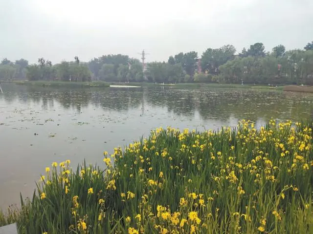 5月10日下午,北京迎來一場陣雨,記者前往龍?zhí)段骱珗@探訪。雨下得不小,但公園內(nèi)的路面上卻沒有什么積水,這是因為步道鋪設的大量透水磚使得雨水可以快速下滲。走近湖邊,一大片盛放的黃色鳶尾花在雨中顯得越發(fā)嬌艷。