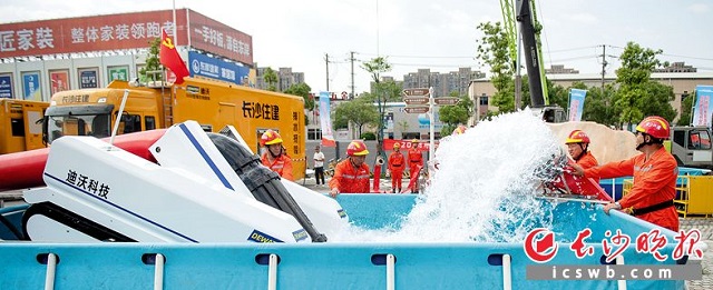 因雨勢加大,某地鐵站出現(xiàn)內(nèi)澇,嚴重影響地鐵運行安全。市城區(qū)防辦緊急調(diào)度防澇排漬搶險隊一輛高揚程排水搶險車趕赴現(xiàn)場處置……不必擔心,這驚險的一幕,只是2024年長沙市城區(qū)應(yīng)對超強降雨防澇排漬聯(lián)合應(yīng)急演練中的場景。5月15日,在隆平水稻博物館前坪,共有11支搶險隊伍、135人參加演練。一小時能吸干兩個泳池的超級吸水“牛魔王”5000型子母式大流量排水搶險車、排水揚程超過15層樓高的900型高揚程排水搶險車等排水“超級”裝備紛紛亮相、大顯身手。