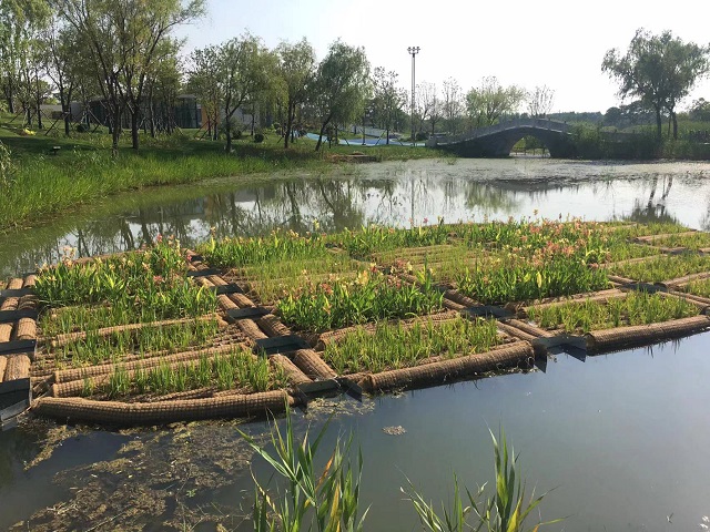 公園中部,寬闊的紫薇大道南北貫穿,連接南北入口。在大道最北端一座橋梁的北側,建設了2個雨水花園,收集周圍的雨水,里面栽種了細葉美女櫻、彩虹石竹、花葉玉簪、紫葉山桃草、花葉美人蕉、細葉芒、矮生蘆竹等多種植物。橋西的河面上,還設置了以太陽能作動力的生態(tài)浮床,用于改善河道水質。河道沿線還建設了可溢流生態(tài)屏障,雨水進入可溢流生態(tài)屏障,利用植物根系、漂浮濕地、人工水草作為掛膜基質,通過生物接觸氧化技術對微污染雨水進行凈化,從而控制外源污染對自然水體水質的影響。栽植的植物品種主要有常綠鳶尾、千屈菜、再力花、苦草等。