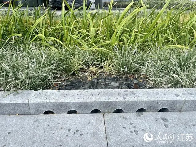 一處雨水花園內,圍住花園的路緣石上,開了6個圓孔??此破胀ǖ脑O計,卻可以使雨水快速導入花園中,這是讓“海綿”吸飽水的第一步。