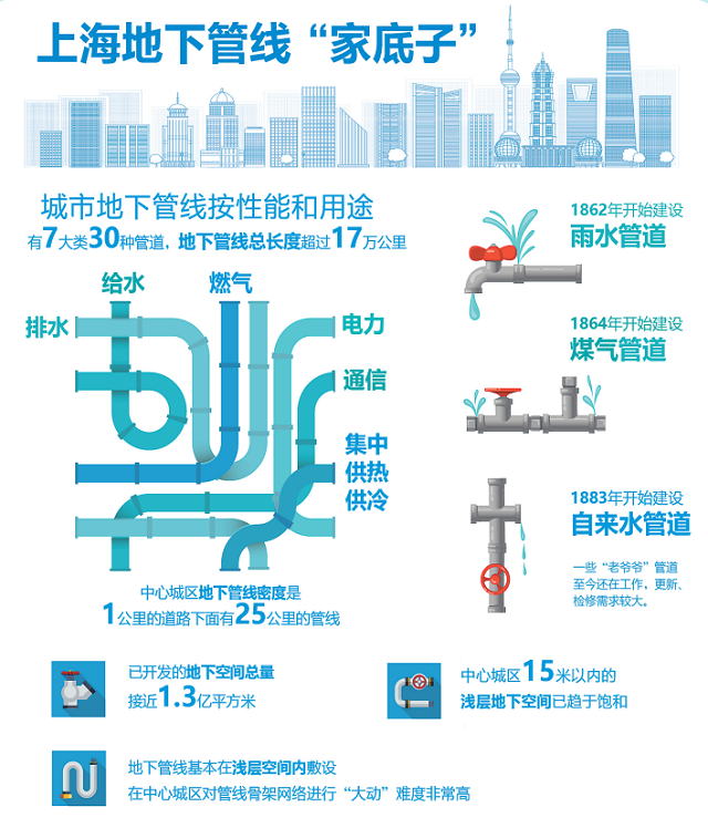 市政管線是城市的生命線。目前上海地下管網(wǎng)按性能和用途已有給水、排水、燃氣、電力、通信、集中供熱供冷等7大類30種管道,地下管線總長度超過17萬公里。總體而言,上海的地下管線建設和管理一直處于全國領先水平。