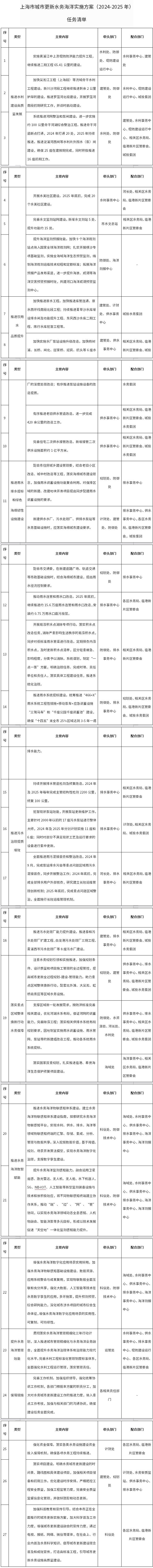 (五) 落實(shí)重點(diǎn)區(qū)域整體煥新行動(dòng)水務(wù)保障 注重水務(wù)規(guī)劃引領(lǐng)和實(shí)施推進(jìn),加強(qiáng)規(guī)劃條件、設(shè)計(jì)質(zhì)量和項(xiàng)目施工管理的全過(guò)程管控,提高城市更新全過(guò)程規(guī)劃-建設(shè)-管理能力,助力重點(diǎn)區(qū)域整體煥新行動(dòng),配套完善北外灘、大吳淞、虹橋商務(wù)區(qū)等區(qū)域水務(wù)設(shè)施。支撐區(qū)域新一輪發(fā)展需求,按防洪標(biāo)準(zhǔn)完善相關(guān)建設(shè),優(yōu)化河湖水系布局,保證河網(wǎng)的調(diào)蓄能力,完善除澇工程;落實(shí)相關(guān)供排水系統(tǒng)布局規(guī)劃要求,因地制宜實(shí)施雨水調(diào)蓄設(shè)施、雨水管網(wǎng)、泵站等的新建或改造工程,推動(dòng)各系統(tǒng)雨水系統(tǒng)提標(biāo)。落實(shí)國(guó)家雙重規(guī)劃,扎實(shí)推進(jìn)臨港、奉賢海洋生態(tài)保護(hù)修復(fù)項(xiàng)目建設(shè)。(牽頭部門(mén):規(guī)劃處、防御處、建管處、水資源處、河長(zhǎng)處、水利處、海域處,配合部門(mén):供水事務(wù)中心、排水事務(wù)中心、海洋事務(wù)中心、相關(guān)區(qū)水務(wù)局、臨港新片區(qū)管委會(huì)、城投水務(wù)集團(tuán))