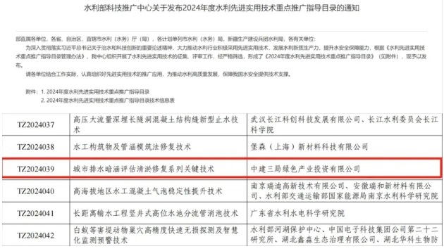 近日,中建三局綠投公司科研成果“城市主干排水暗涵評(píng)估清淤修復(fù)關(guān)鍵技術(shù)研究應(yīng)用”成功入選《2024年水利部先進(jìn)技術(shù)重點(diǎn)推廣指導(dǎo)目錄》。該目錄旨在圍繞國(guó)家重大戰(zhàn)略實(shí)施,和水利高質(zhì)量發(fā)展需求,遴選先進(jìn)、成熟、實(shí)用的技術(shù),面向社會(huì)公布,推動(dòng)行業(yè)技術(shù)水平升級(jí)提高。