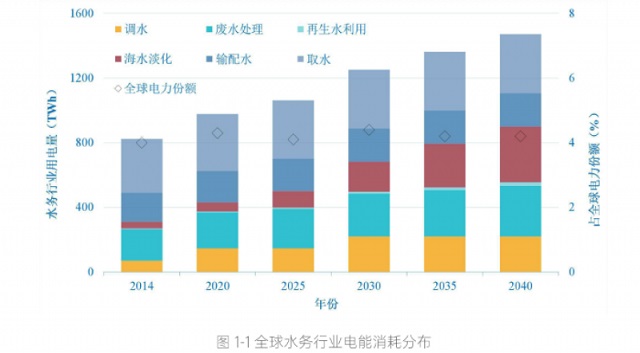而污水處理不僅是水質(zhì)凈化的過(guò)程,也是實(shí)現(xiàn)碳中和的重要組成部分。從能耗強(qiáng)度來(lái)看,城鎮(zhèn)水務(wù)一直被冠以能源密集型、高耗能行業(yè)。根據(jù)國(guó)際能源機(jī)構(gòu)/IEA數(shù)據(jù),水務(wù)行業(yè)耗電量(包括了遠(yuǎn)距離調(diào)水和海水淡化)占到全球總耗電量的4%至6%,取水、污水處理和輸配水是耗電量最高的3個(gè)環(huán)節(jié)。