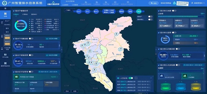 實現排水管理三個全覆蓋:構建“戶-網-廠-河”協同聯動管理體系,實現智能排水管理三個全覆蓋,達到“家底清、情況明”的目標。一是從源頭到末端的排水設施全覆蓋:覆蓋廣州11個區195414個排水戶、39734個排水單元、1240座閘泵站、64座污水處理廠、98281個排水口等設施。二是城鄉排水設施全覆蓋:覆蓋41118公里市政管渠,3778公里城中村管渠。三是市區管理機構和人員全覆蓋:串聯一線巡查人員16738名,各級管理人員759名。